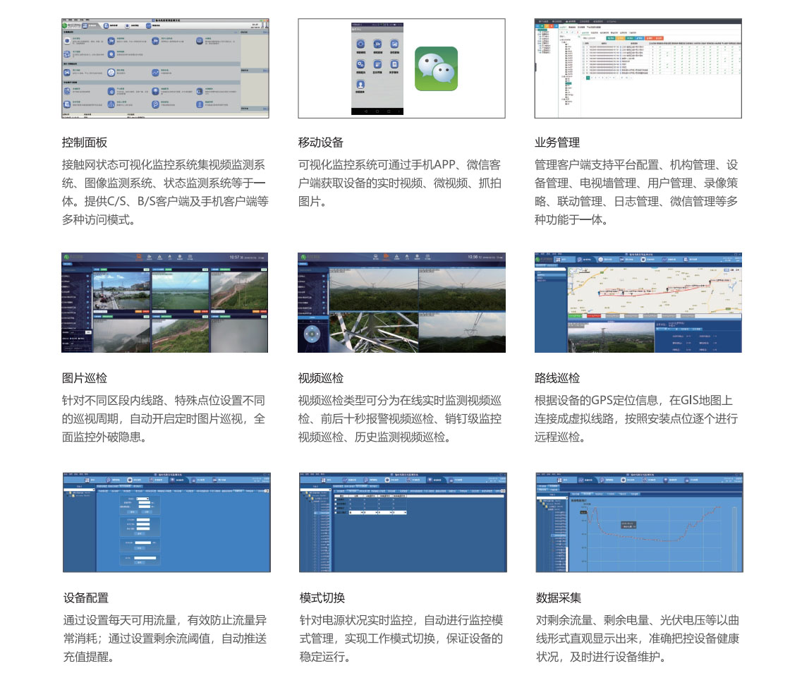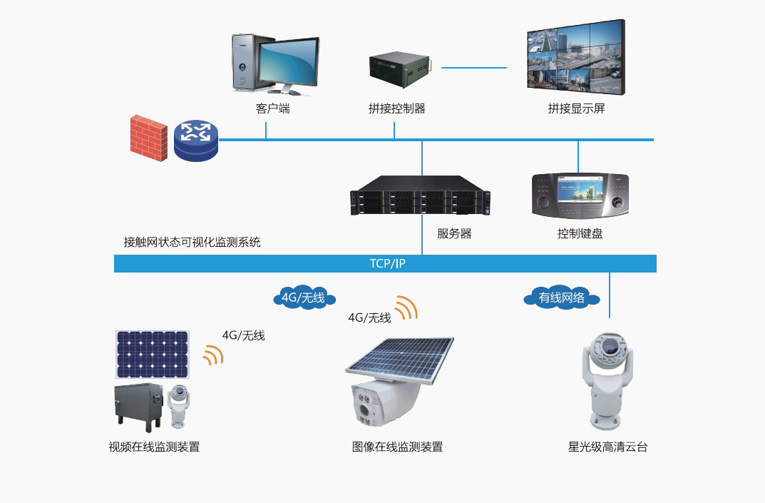 鐵路供電的特點是線路長,地點偏僻,環(huán)境復(fù)雜,單純依靠人工巡檢效果差,安全風(fēng)險大,隱患重重,供電安全直接影響著鐵路運輸?shù)恼V刃?。接觸網(wǎng)狀態(tài)可視化監(jiān)控系統(tǒng)是一套全方位監(jiān)管電氣化鐵路牽引供電線路的遠(yuǎn)程巡檢系統(tǒng),該系統(tǒng)根據(jù)高速鐵路供電設(shè)備運行的安全需求,可對上跨橋、上跨電力線、隧道出入口、大風(fēng)區(qū)等重點位置進行圖像/視頻監(jiān)測,對故障事件起到“早發(fā)現(xiàn)、早預(yù)防”的作用,保障高速鐵路運營秩序,保障電氣化鐵路接觸網(wǎng)高效、安全、可靠的運行