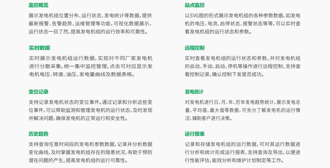 應急發電機集中監控系統由發電機監控裝置和集中監控中心組成。發電機監控裝置采集每臺發電機、發動機的數據以及運行工況,通過無線或者有線的通訊方式實時傳輸至集中監控中心。 集中監控中心可集中監控發電機的運行工況,并將采集的數據進行存儲,形成歷史報表、歷史曲線;實現遠程參數設置、遠程啟停發電機;設備自動化管理,切實保障應急發電機的正常運行。